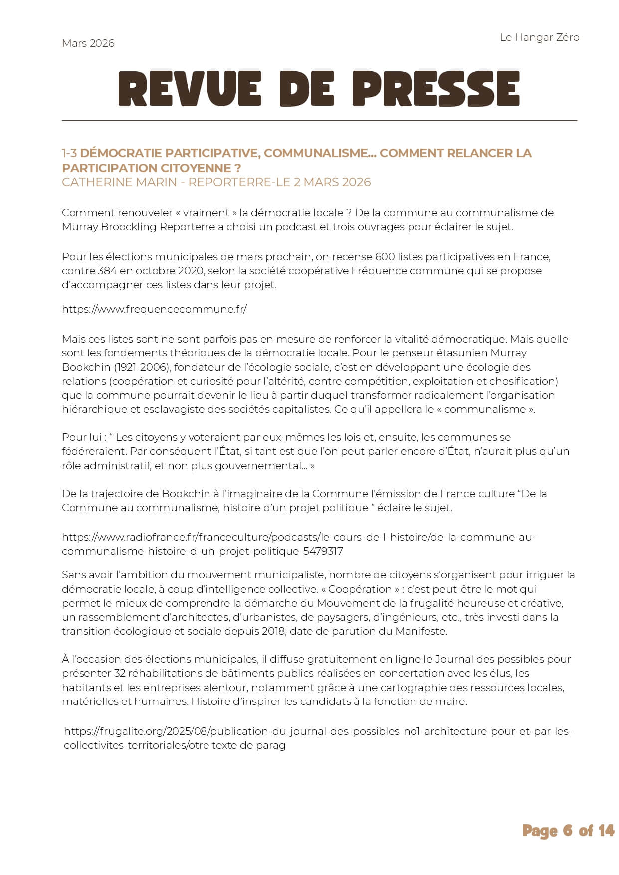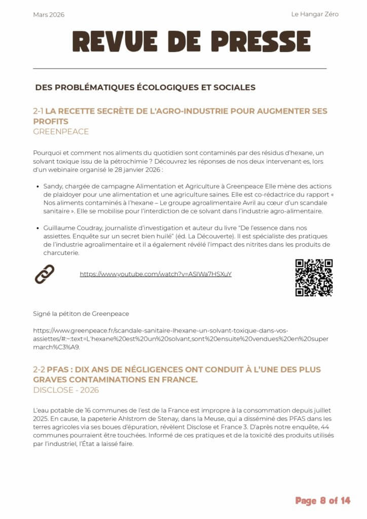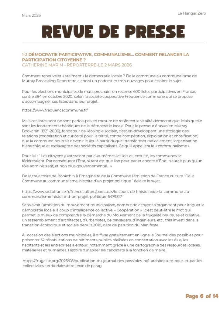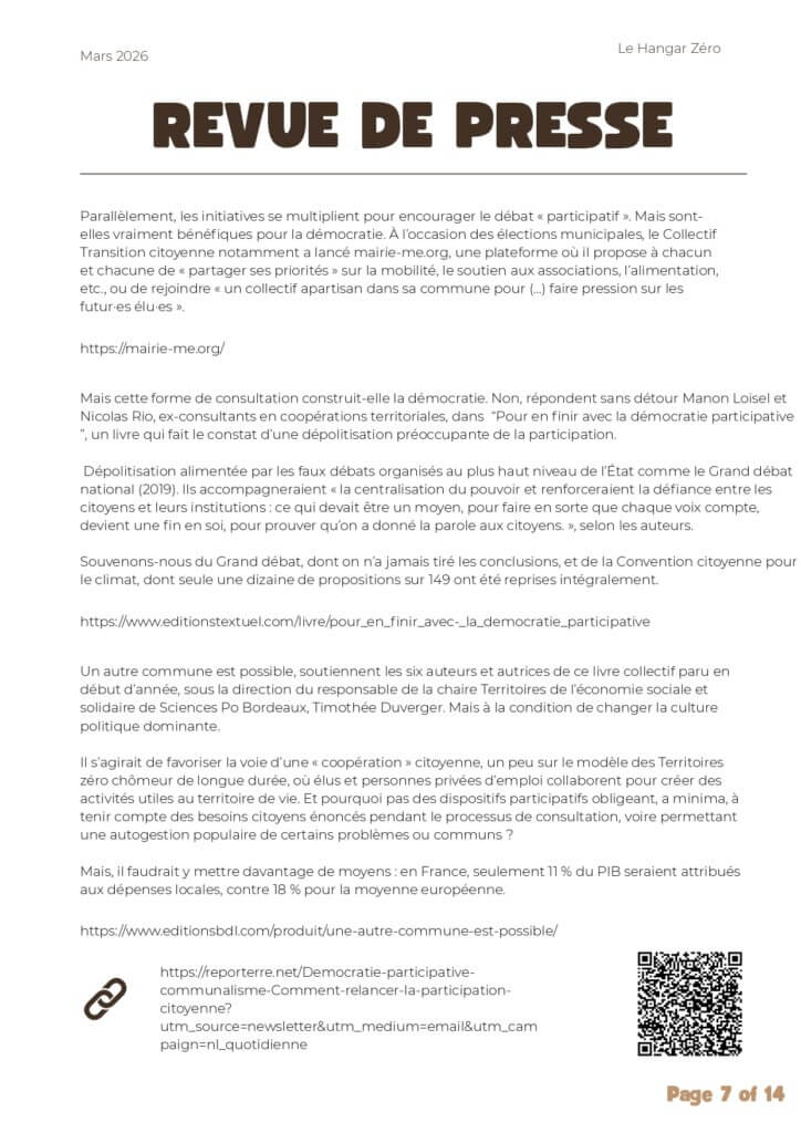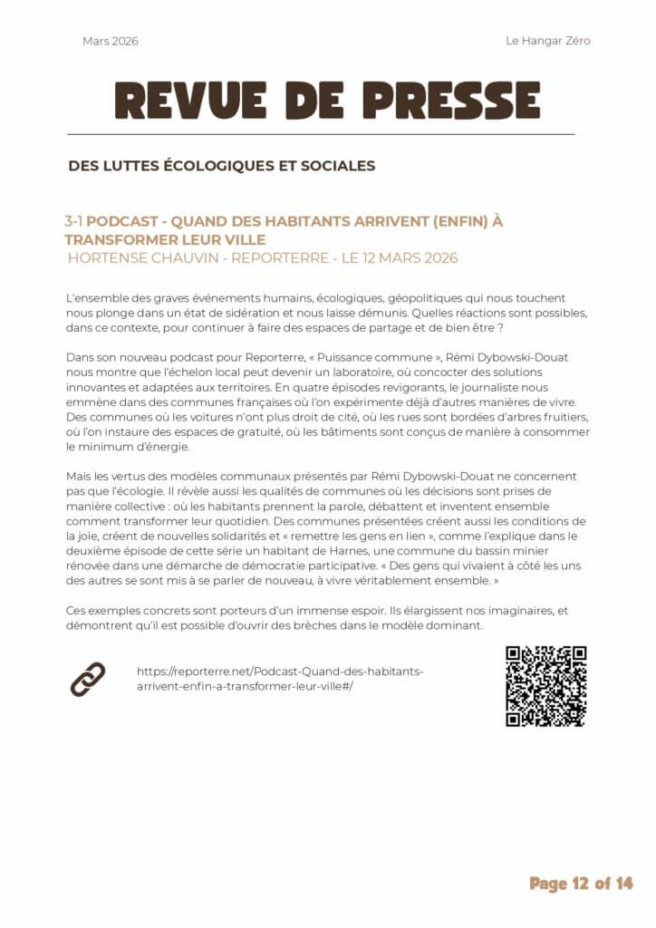 Chaque mois, le Hangar Zéro vous propose une sélection d’articles, enquêtes et ressources pour nourrir la réflexion autour des enjeux écologiques, sociaux et démocratiques 🌱